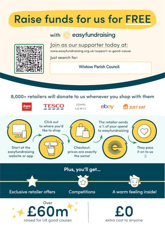 You can raise FREE donations for Wistow Parish Council EVERY time you shop online. Just use #easyfundraising! Over 8,000 retailers will donate, including all the big names like John Lewis & Partners, BT, Expedia, Argos, ASOS, Just Eat, Uswitch and many more! Please support us.